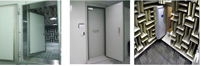 隔音门由内外两套门组成,外门用于隔声,内门用于吸声。通外门是向外开,内门向内开 ,内门贴吸音尖劈,门开口尺寸:1. 2M*2M。施工效果如图。